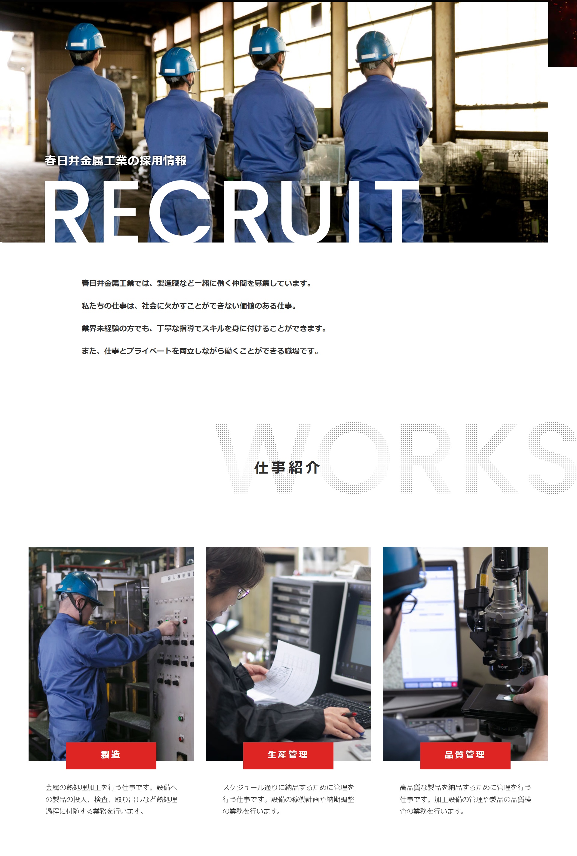 H.P制作 春日井金属工業様によるH.P制作をさせていただきました。 金属部品を熱処理加工する作業など、 職人らしさが表現できるよう撮影に力を入れました。 https://htec-kasugai.co.jp/ >PREV WORKS LIST NEXT